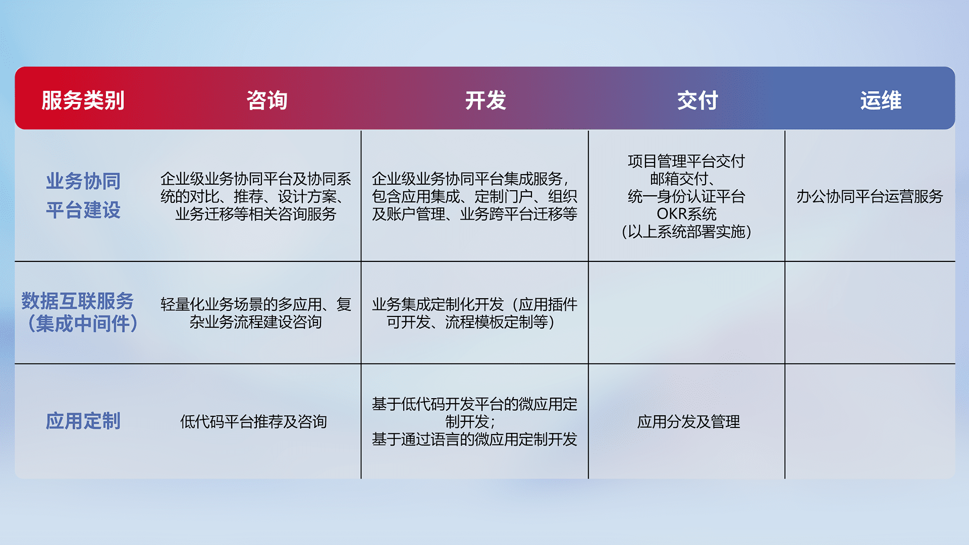 针对钉钉、、、企微、、、、IDaas等平台级产品提供产品的规划、、方案、、交付、、、、定制化开发等服务,,,,实现如统一协同办公、、、、智能客户服务、、、混合会议管理、、、、智能数据查询、、、、等业务场景,,,实现数字化转型。。